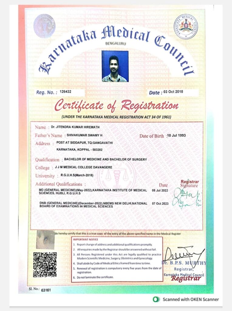• Permanent medical registration legally authorizing medical practice in the state of Karnataka.