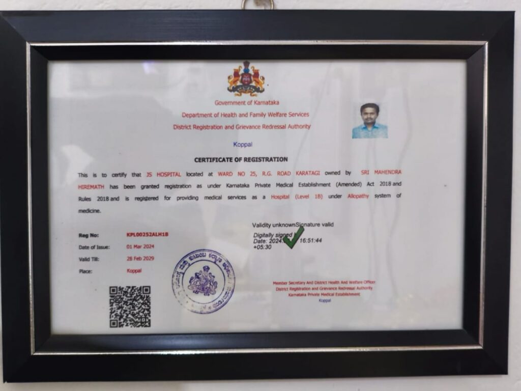 • Official government registration authorizing JS Hospital to provide medical services under Karnataka Private Medical Establishment Act.